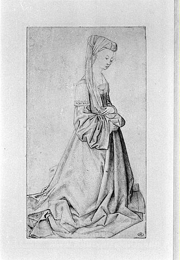 Ti offriamo una riproduzione artigianale su tela dell'opera famosa 'Donna inginocchiata' di Rogier van der Weyden, dal Museo delle Riproduzioni.