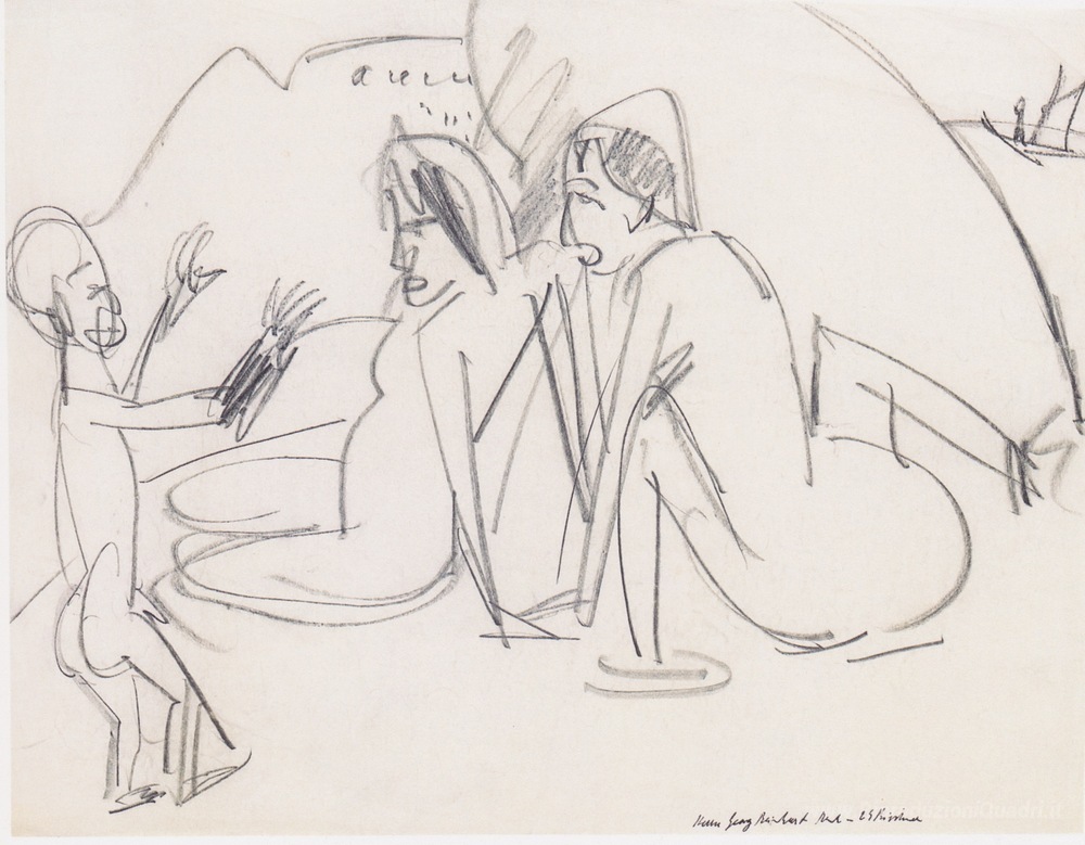 Ti offriamo una riproduzione artigianale su tela dell'opera famosa 'Donne e sculture sulla spiaggia' di Ernst Ludwig Kirchner, dal Museo delle Riproduzioni.