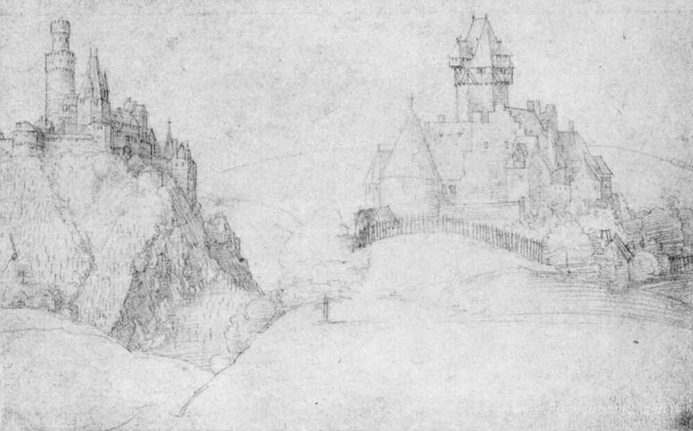 Ti offriamo una riproduzione artigianale su tela dell'opera famosa 'Due Castelli' di Albrecht Durer, dal Museo delle Riproduzioni.