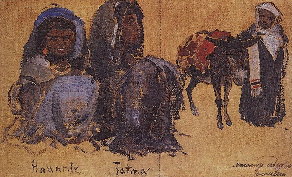 Ti offriamo una riproduzione artigianale su tela dell'opera famosa 'Due figure femminili. Una figura maschile con un asino.' di Vasily Polenov, dal Museo delle Riproduzioni.