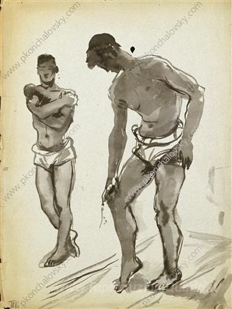 Ti offriamo una riproduzione artigianale su tela dell'opera famosa 'Due modelli in piedi' di Pyotr Konchalovsky, dal Museo delle Riproduzioni.