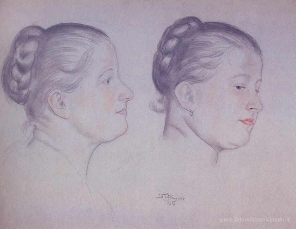Ti offriamo una riproduzione artigianale su tela dell'opera famosa 'Due ritratti di Annushka' di Boris Kustodiev, dal Museo delle Riproduzioni.