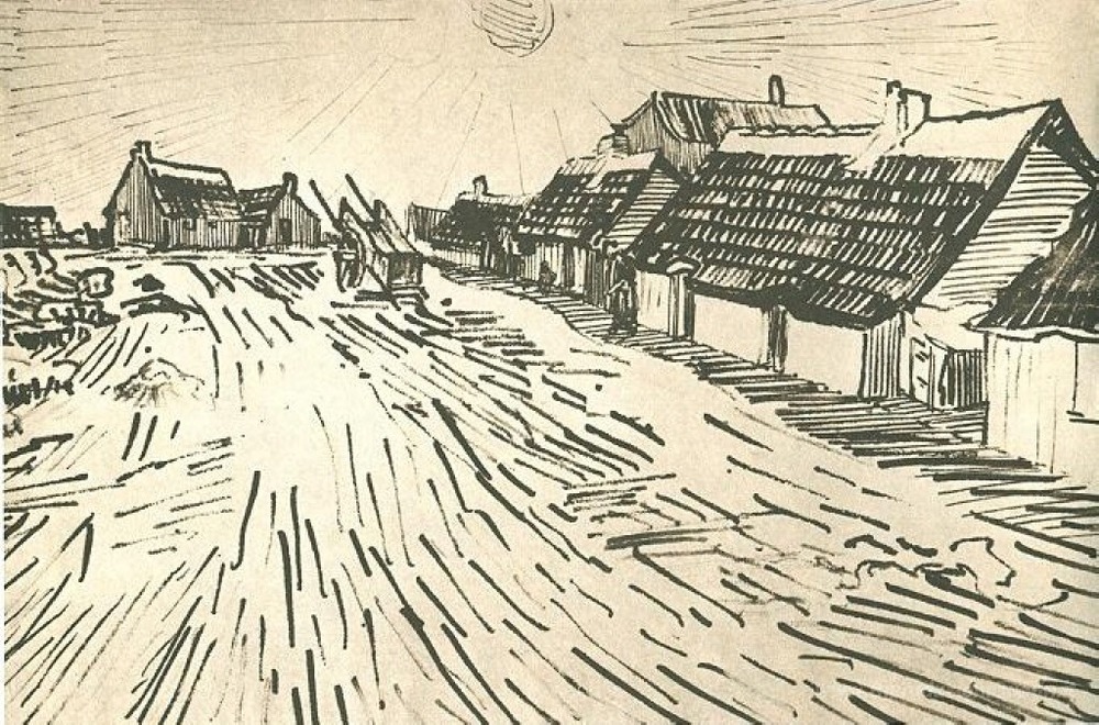 Ti offriamo una riproduzione artigianale su tela dell'opera famosa 'Fila di Cottages a Saintes-Maries' di Vincent van Gogh, dal Museo delle Riproduzioni.