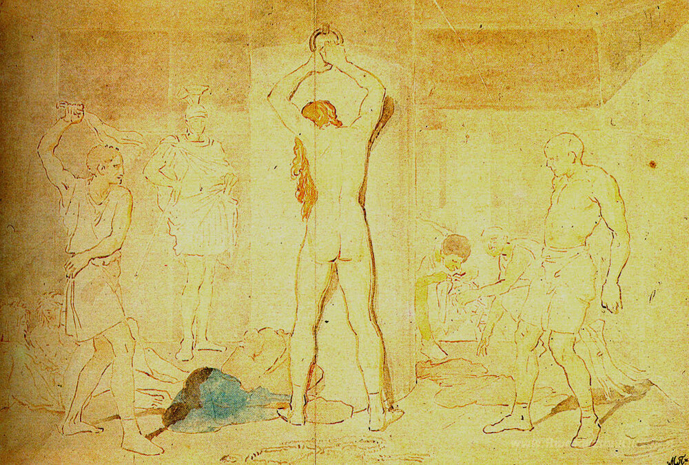 Ti offriamo una riproduzione artigianale su tela dell'opera famosa 'Flagellazione di Cristo' di Alexander Ivanov, dal Museo delle Riproduzioni.
