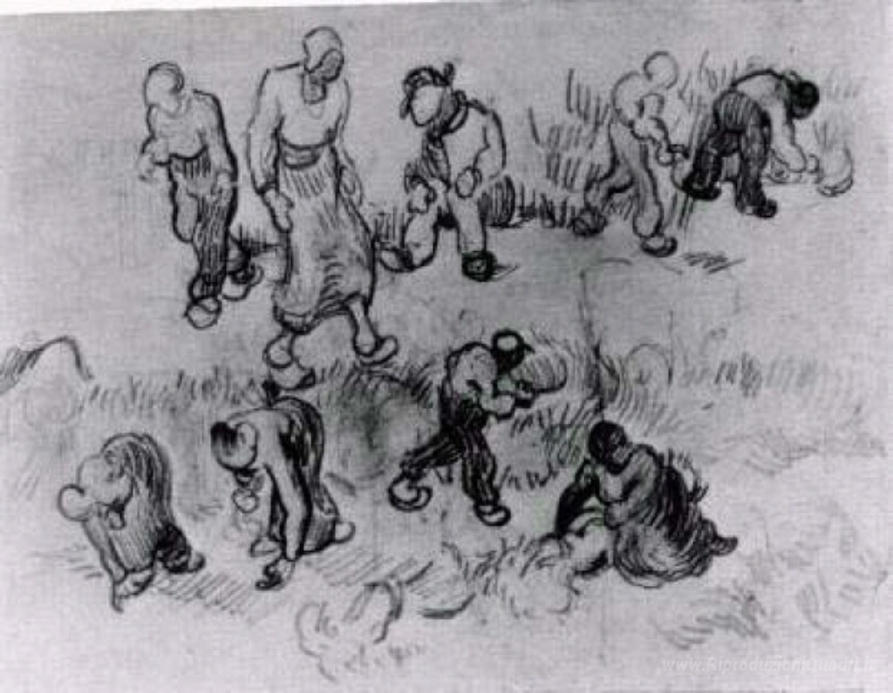 Ti offriamo una riproduzione artigianale su tela dell'opera famosa 'Foglio con numerosi schizzi di persone che lavorano' di Vincent van Gogh, dal Museo delle Riproduzioni.