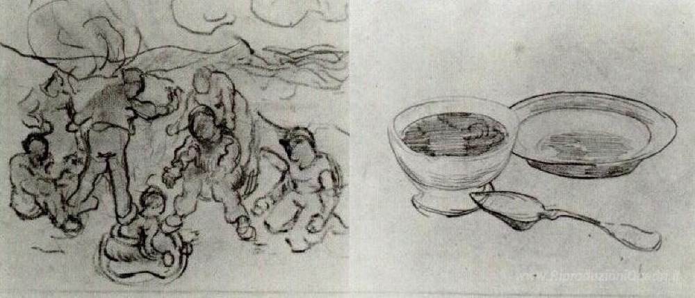 Ti offriamo una riproduzione artigianale su tela dell'opera famosa 'Foglio con schizzi di figure' di Vincent van Gogh, dal Museo delle Riproduzioni.