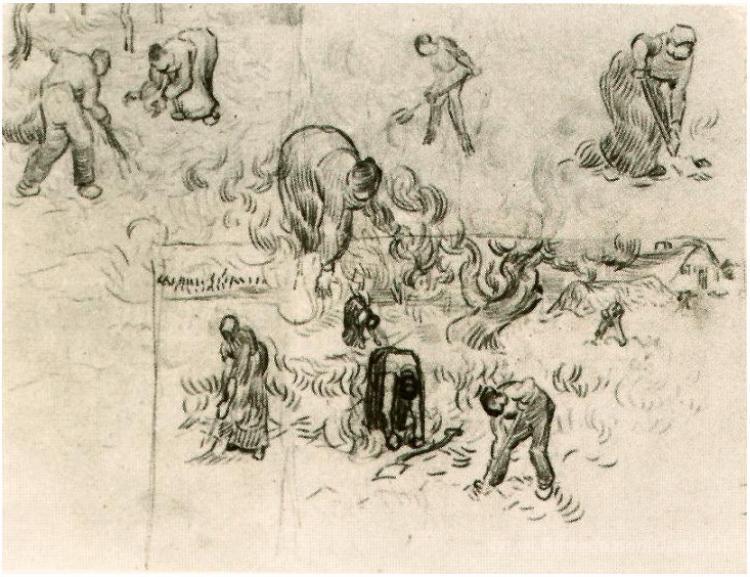 Ti offriamo una riproduzione artigianale su tela dell'opera famosa 'Foglio con schizzi di persone che lavorano' di Vincent van Gogh, dal Museo delle Riproduzioni.