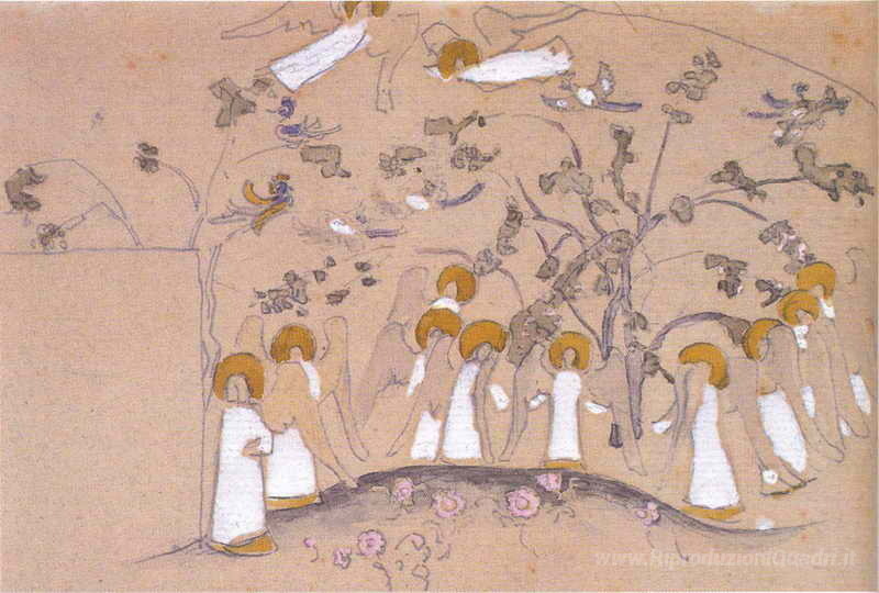 Ti offriamo una riproduzione artigianale su tela dell'opera famosa 'Giardino dell'Eden' di Nicholas Roerich, dal Museo delle Riproduzioni.