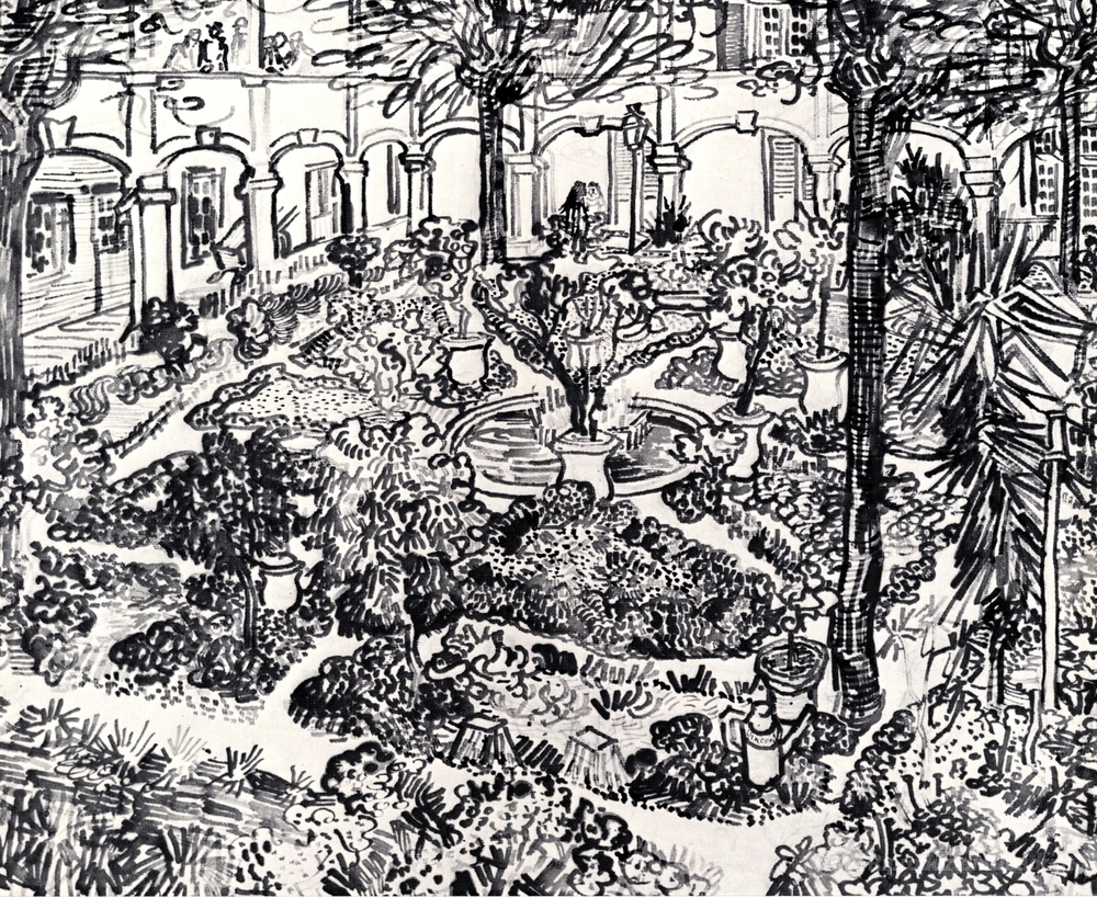 Ti offriamo una riproduzione artigianale su tela dell'opera famosa 'Il cortile dell'ospedale a Arles' di Vincent van Gogh, dal Museo delle Riproduzioni.