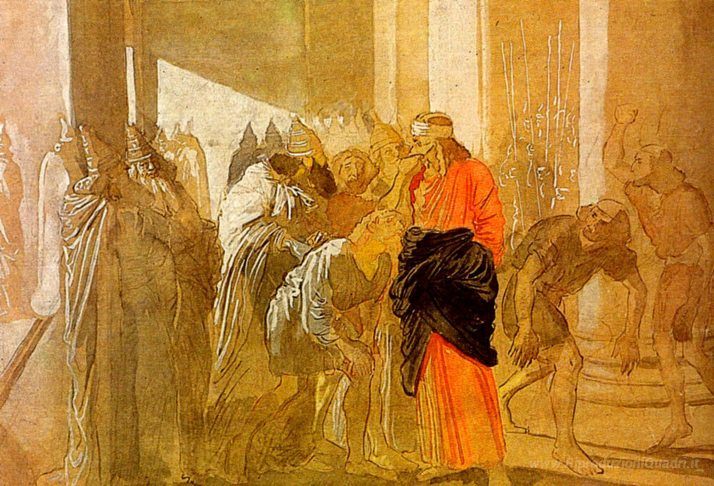 Ti offriamo una riproduzione artigianale su tela dell'opera famosa 'Il Cristo deriso. Dai bozzetti biblici.' di Alexander Ivanov, dal Museo delle Riproduzioni.