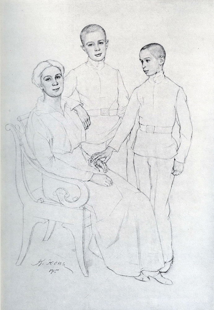 Ti offriamo una riproduzione artigianale su tela dell'opera famosa 'Il Family Portrait (Klavdiya Yuon, moglie dell'artista, ei figli' di Konstantin Yuon, dal Museo delle Riproduzioni.