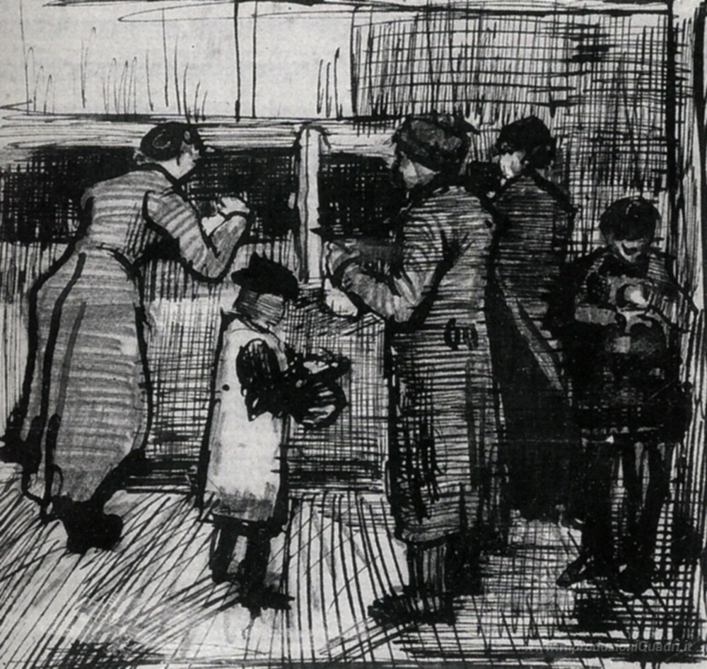 Ti offriamo una riproduzione artigianale su tela dell'opera famosa 'Il pubblico Soup Kitchen' di Vincent van Gogh, dal Museo delle Riproduzioni.