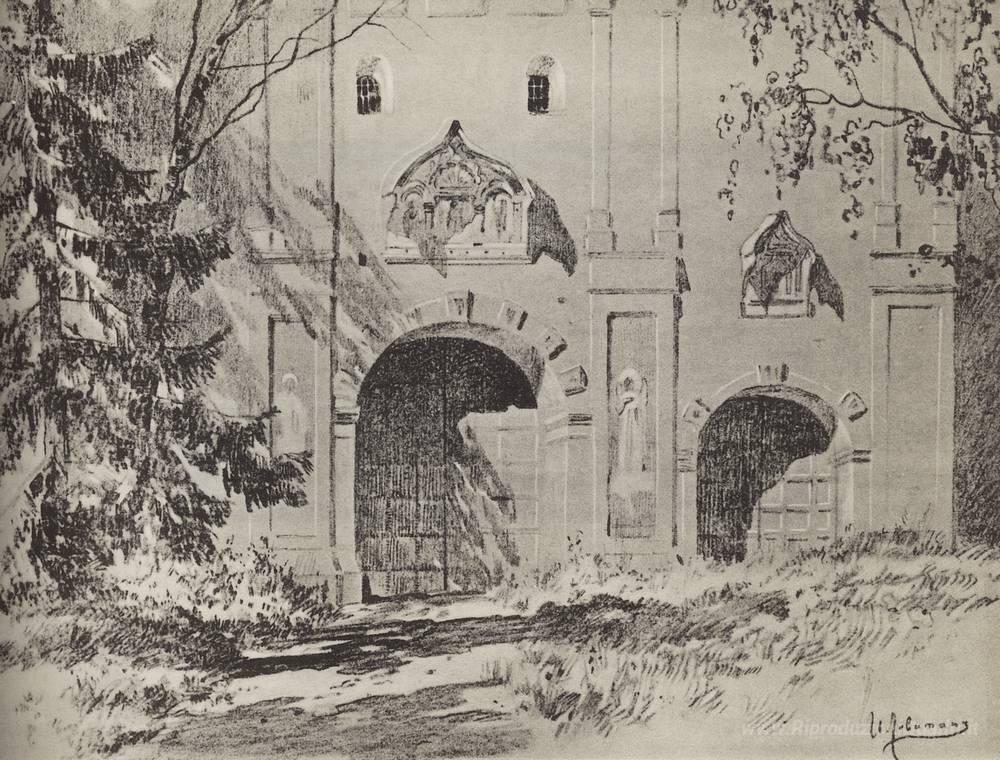 Ti offriamo una riproduzione artigianale su tela dell'opera famosa 'Ingresso cancello di Savvinsky monastero vicino Zvenigorod' di Isaac Levitan, dal Museo delle Riproduzioni.
