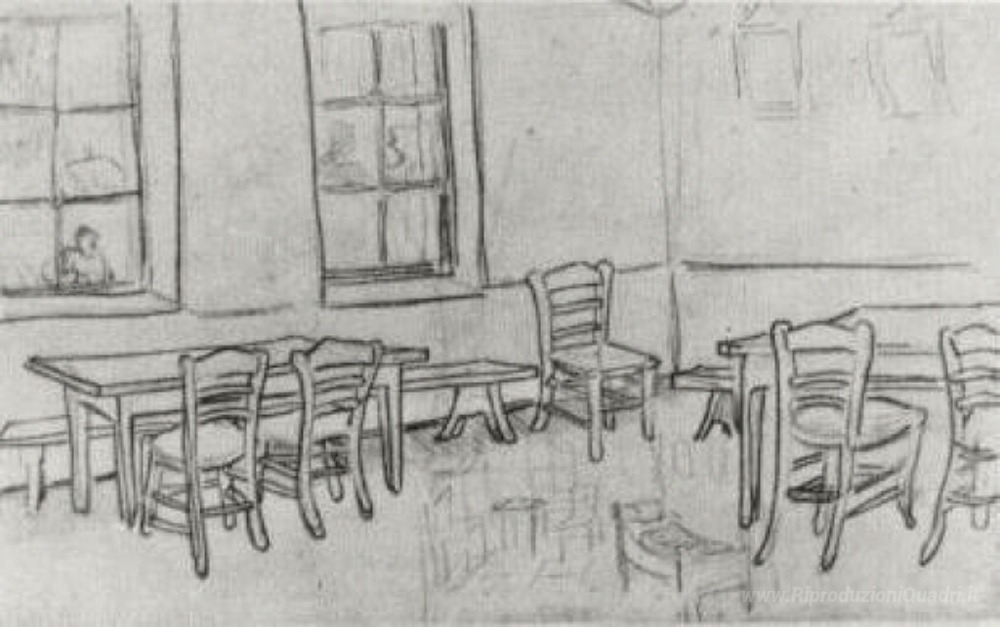 Ti offriamo una riproduzione artigianale su tela dell'opera famosa 'Interno di un ristorante' di Vincent van Gogh, dal Museo delle Riproduzioni.