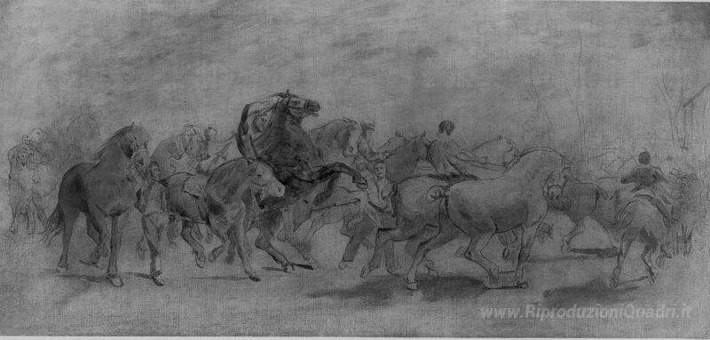Ti offriamo una riproduzione artigianale su tela dell'opera famosa 'La Fiera dei cavalli (studio)' di Rosa Bonheur, dal Museo delle Riproduzioni.