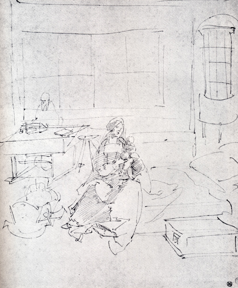 Ti offriamo una riproduzione artigianale su tela dell'opera famosa 'La Sacra Famiglia In Una Stanza' di Albrecht Durer, dal Museo delle Riproduzioni.