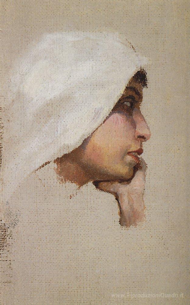 Ti offriamo una riproduzione artigianale su tela dell'opera famosa 'La testa di una giovane donna in un velo bianco' di Vasily Polenov, dal Museo delle Riproduzioni.