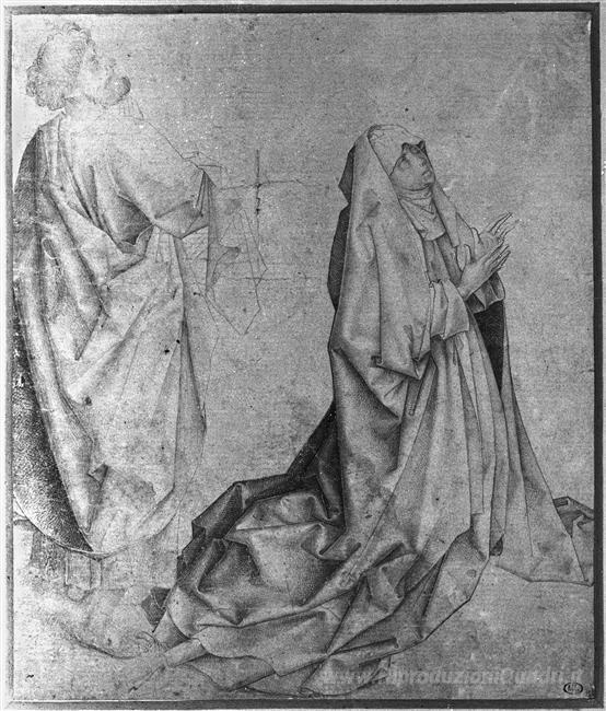Ti offriamo una riproduzione artigianale su tela dell'opera famosa 'La Vergine inginocchiata e pregare dietro San Pietro' di Rogier van der Weyden, dal Museo delle Riproduzioni.