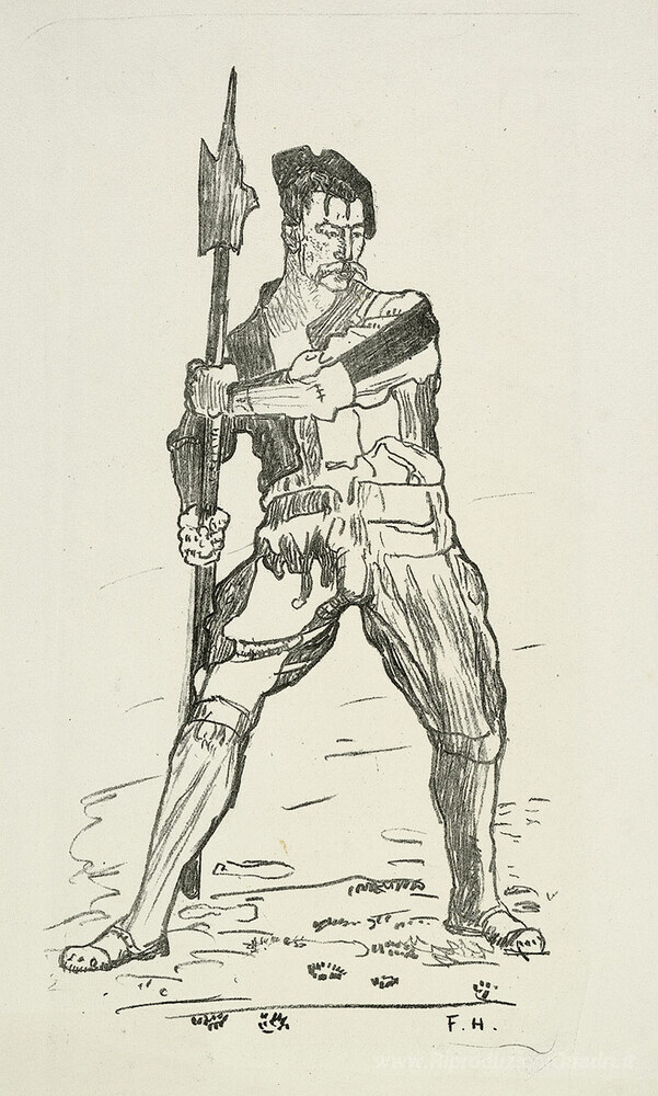 Ti offriamo una riproduzione artigianale su tela dell'opera famosa 'Landsknecht con l'alabarda' di Ferdinand Hodler, dal Museo delle Riproduzioni.