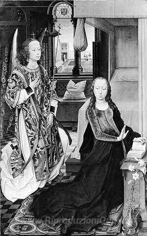 Ti offriamo una riproduzione artigianale su tela dell'opera famosa 'L'Annunciazione' di Rogier van der Weyden, dal Museo delle Riproduzioni.