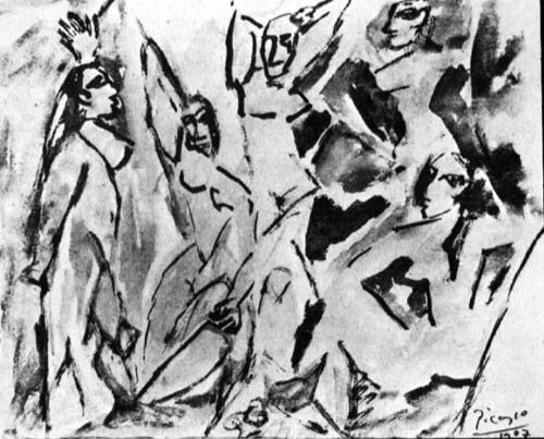 Ti offriamo una riproduzione artigianale su tela dell'opera famosa 'Le ragazze di Avignone (studio)' di Pablo Picasso, dal Museo delle Riproduzioni.