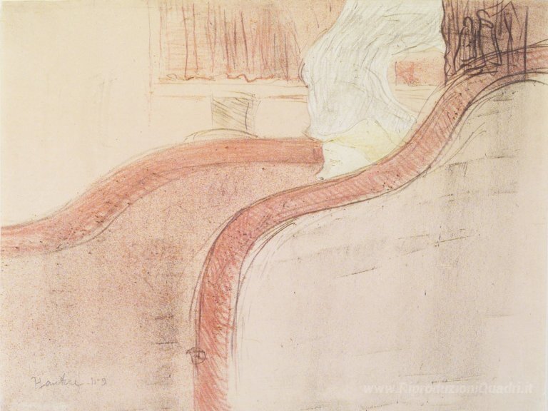 Ti offriamo una riproduzione artigianale su tela dell'opera famosa 'Little Lodge' di Henri de Toulouse-Lautrec, dal Museo delle Riproduzioni.