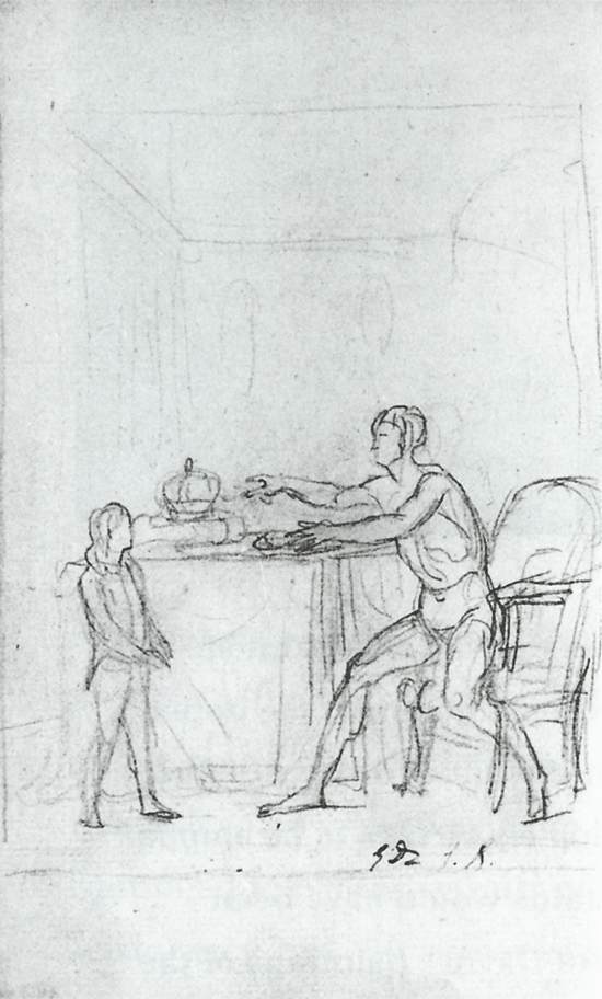 Ti offriamo una riproduzione artigianale su tela dell'opera famosa 'Luigi XVI Mostrando la Costituzione a suo Figlio, il Delfino' di Jacques-Louis David, dal Museo delle Riproduzioni.