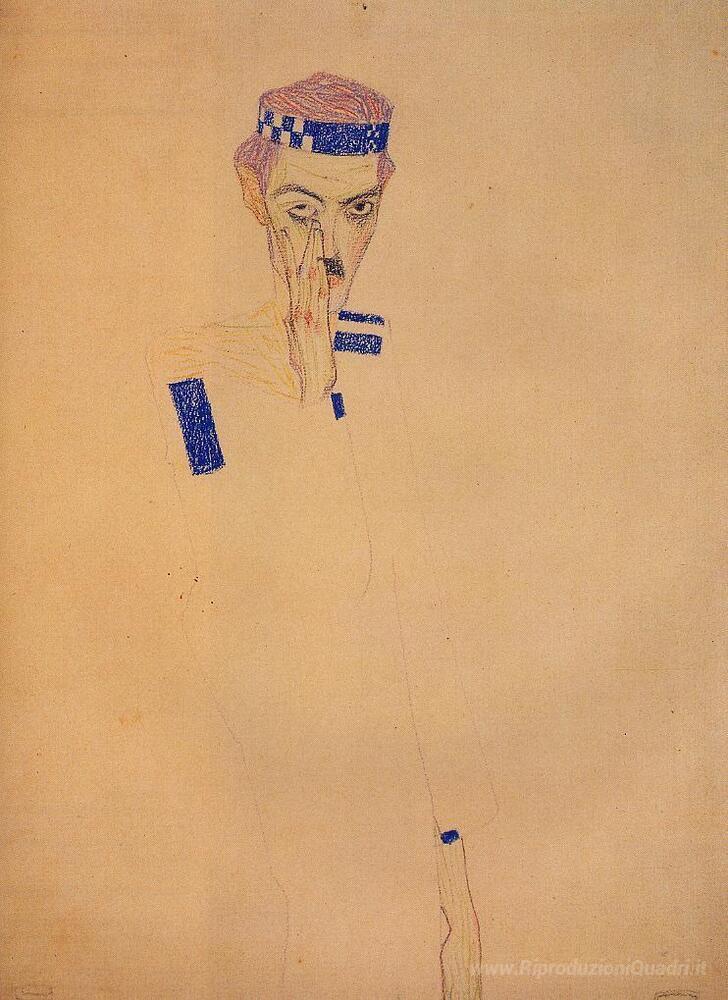 Ti offriamo una riproduzione artigianale su tela dell'opera famosa 'L'uomo con la fascia blu e la mano sulla guancia' di Egon Schiele, dal Museo delle Riproduzioni.