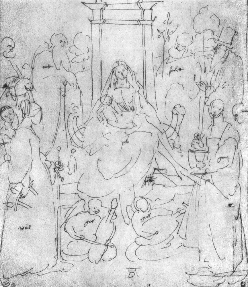 Ti offriamo una riproduzione artigianale su tela dell'opera famosa 'Madonna col Bambino, santi e angeli che suonano' di Albrecht Durer, dal Museo delle Riproduzioni.