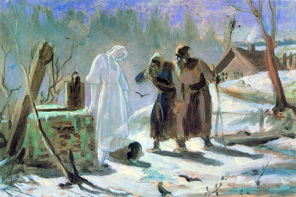 Ti offriamo una riproduzione artigianale su tela dell'opera famosa 'Melting Snow Maiden. Sketch' di Vasily Perov, dal Museo delle Riproduzioni.