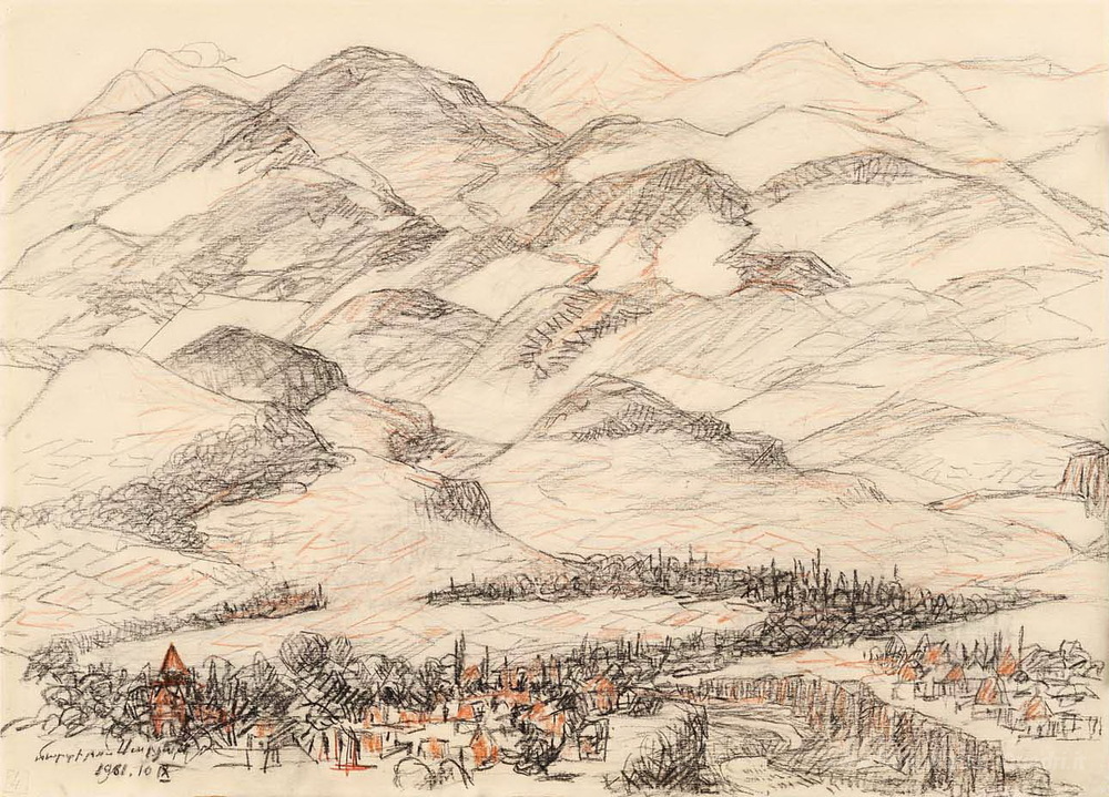 Ti offriamo una riproduzione artigianale su tela dell'opera famosa 'Montagne' di Martiros Saryan, dal Museo delle Riproduzioni.