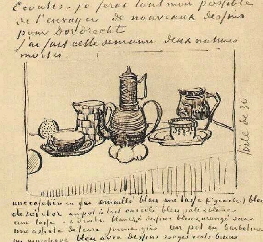 Ti offriamo una riproduzione artigianale su tela dell'opera famosa 'Natura morta con caffettiera' di Vincent van Gogh, dal Museo delle Riproduzioni.