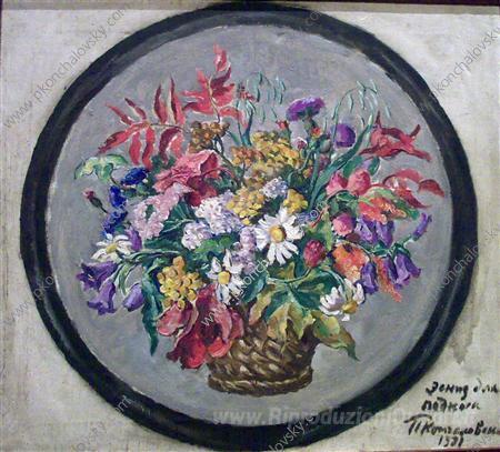 Ti offriamo una riproduzione artigianale su tela dell'opera famosa 'Natura morta. Fiori di autunno in un cestino. Studio per il vass' di Pyotr Konchalovsky, dal Museo delle Riproduzioni.