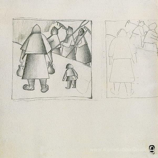 Ti offriamo una riproduzione artigianale su tela dell'opera famosa 'Nel campo' di Kazimir Malevich, dal Museo delle Riproduzioni.