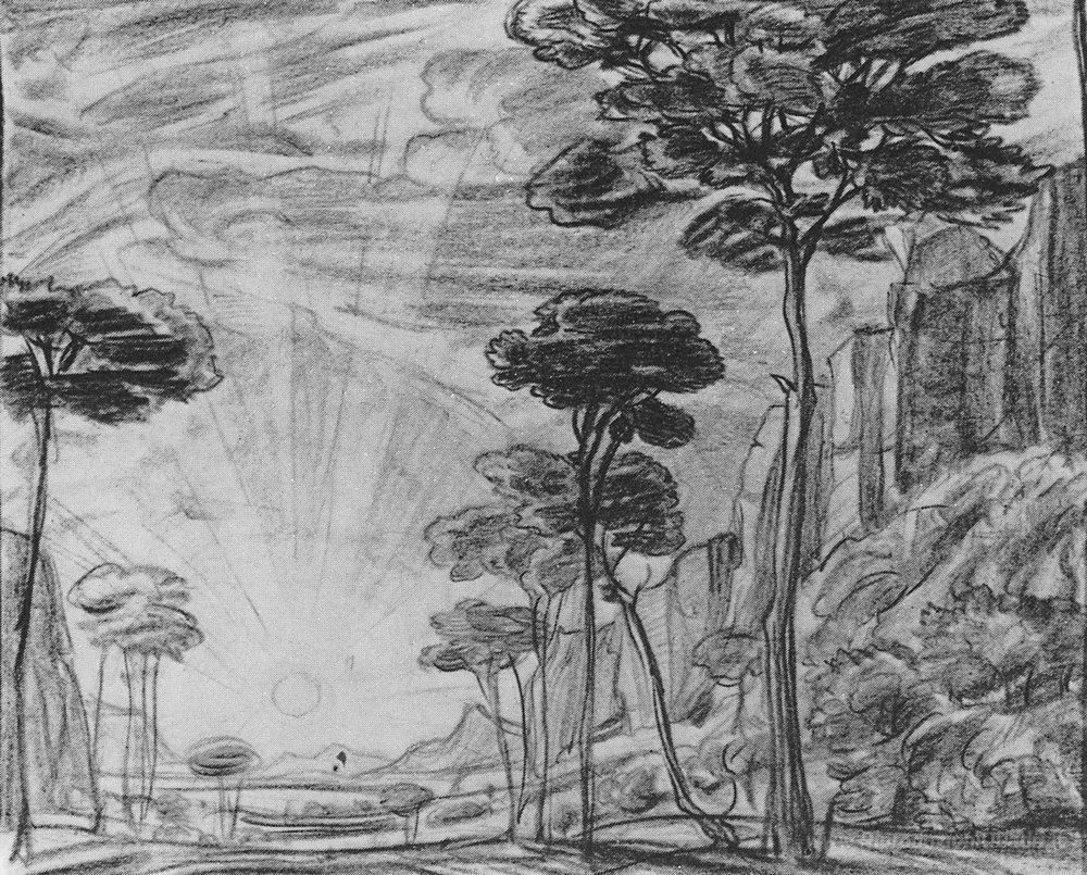 Ti offriamo una riproduzione artigianale su tela dell'opera famosa 'Paesaggio con alberi ad alto fusto' di Konstantin Bogaevsky, dal Museo delle Riproduzioni.