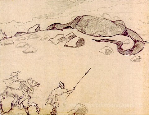 Ti offriamo una riproduzione artigianale su tela dell'opera famosa 'Paesaggio con Dragon' di Nicholas Roerich, dal Museo delle Riproduzioni.