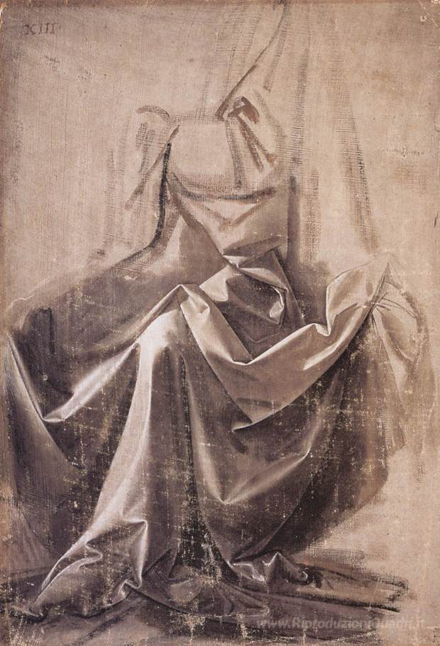 Ti offriamo una riproduzione artigianale su tela dell'opera famosa 'Panneggio per una figura seduta' di Leonardo da Vinci, dal Museo delle Riproduzioni.