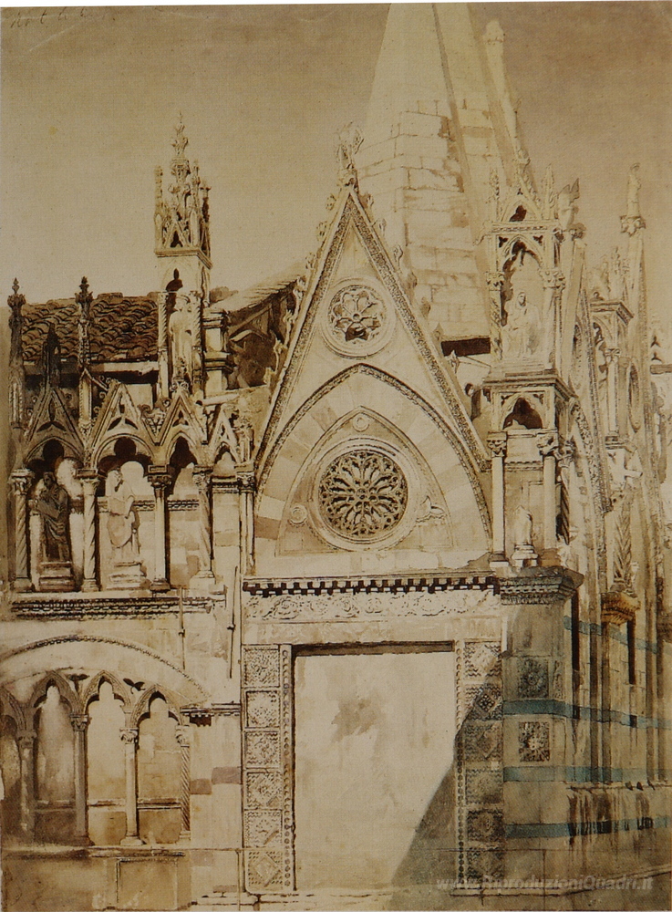 Ti offriamo una riproduzione artigianale su tela dell'opera famosa 'Parte di Santa Maria della Spina Pisa' di John Ruskin, dal Museo delle Riproduzioni.