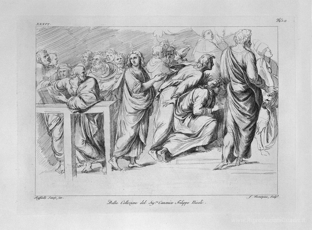 Ti offriamo una riproduzione artigianale su tela dell'opera famosa 'Particolare della Disputa del Sacramento di Raffaello' di Giovanni Battista Piranesi, dal Museo delle Riproduzioni.