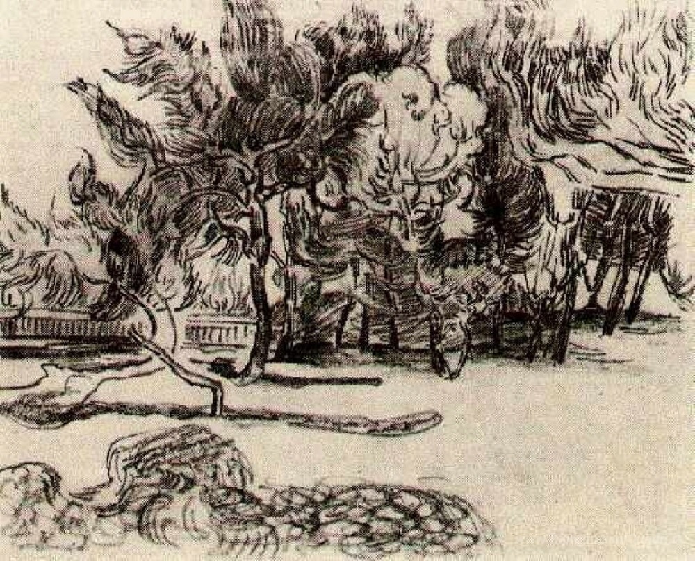Ti offriamo una riproduzione artigianale su tela dell'opera famosa 'Pino alberi vicino il Muro della Asylum' di Vincent van Gogh, dal Museo delle Riproduzioni.