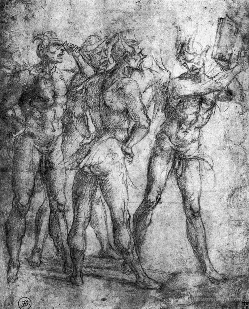 Ti offriamo una riproduzione artigianale su tela dell'opera famosa 'Quattro demoni con un libro' di Luca Signorelli, dal Museo delle Riproduzioni.