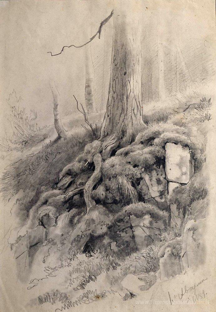 Ti offriamo una riproduzione artigianale su tela dell'opera famosa 'Radici di albero' di Ivan Shishkin, dal Museo delle Riproduzioni.