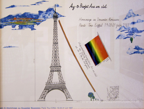 Ti offriamo una riproduzione artigianale su tela dell'opera famosa 'Rainbow Tower Eiffel Progetto Schizzo' di Ay-O, dal Museo delle Riproduzioni.