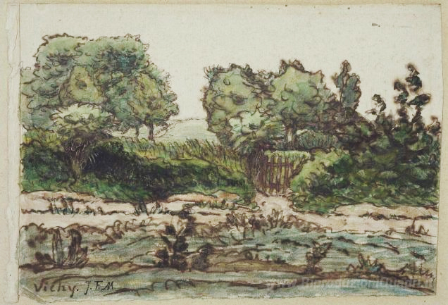 Ti offriamo una riproduzione artigianale su tela dell'opera famosa 'Recinto frutteto vicino a Vichy' di Jean-Francois Millet, dal Museo delle Riproduzioni.