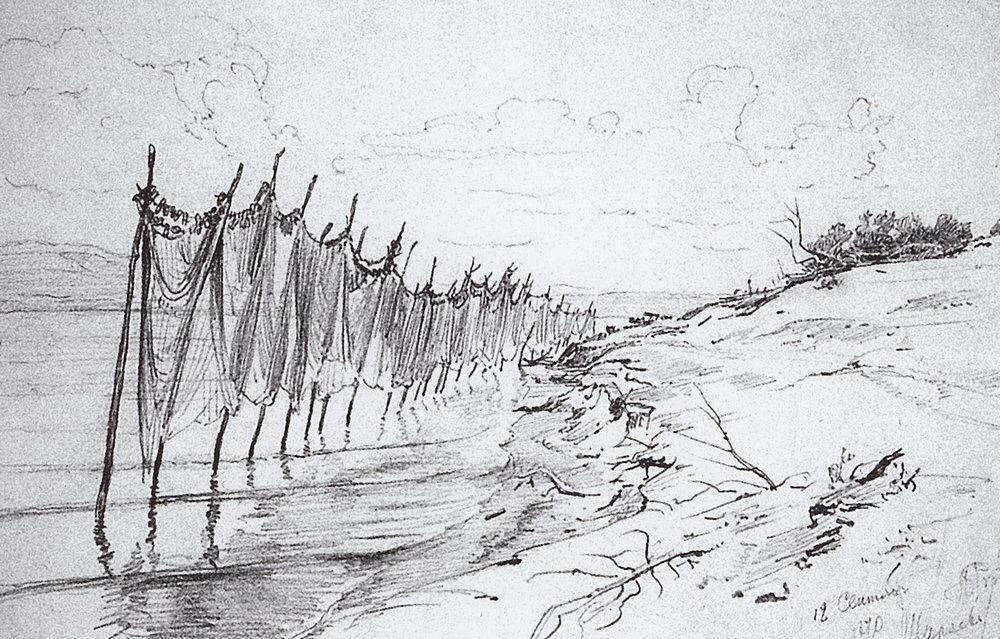 Ti offriamo una riproduzione artigianale su tela dell'opera famosa 'Reti da pesca. Shiryaevo.' di Ilya Repin, dal Museo delle Riproduzioni.