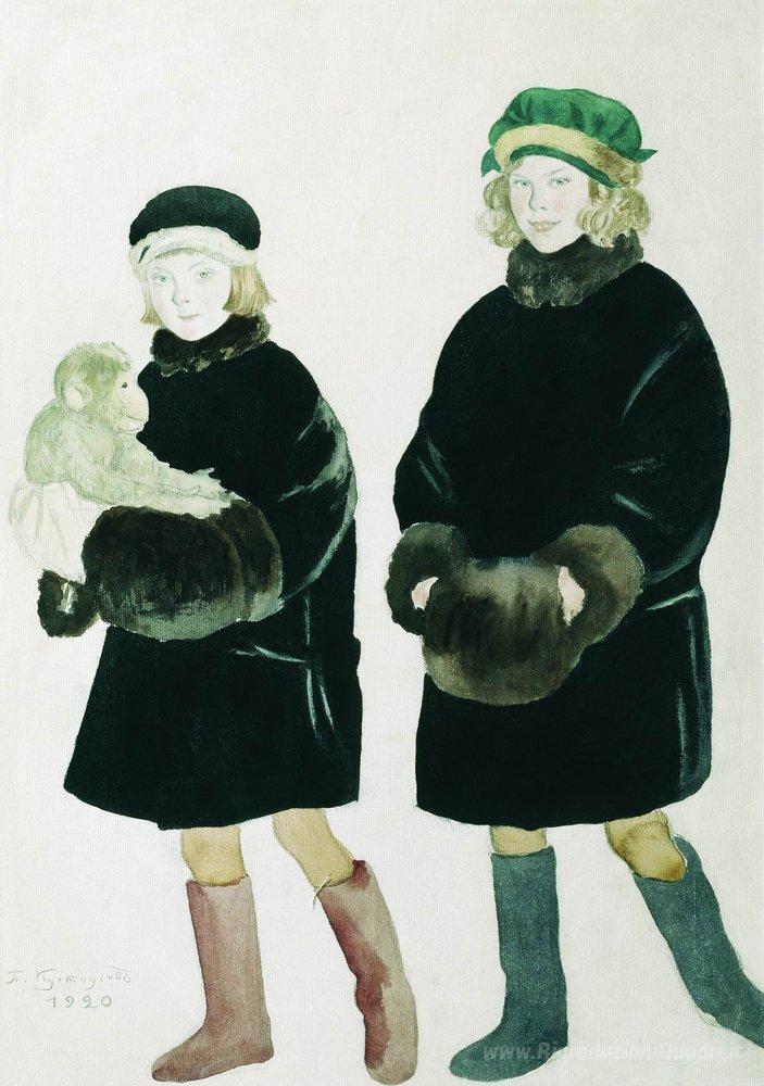 Ti offriamo una riproduzione artigianale su tela dell'opera famosa 'Ritratto di Marta e Marina Chaliapin' di Boris Kustodiev, dal Museo delle Riproduzioni.