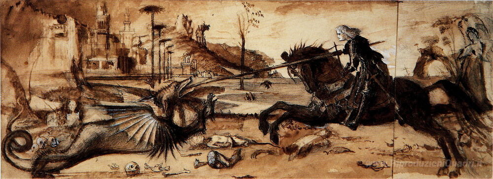 Ti offriamo una riproduzione artigianale su tela dell'opera famosa 'San Giorgio e il drago' di John Ruskin, dal Museo delle Riproduzioni.