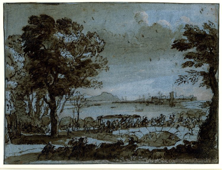 Ti offriamo una riproduzione artigianale su tela dell'opera famosa 'Scena costa con una battaglia su un ponte' di Claude Lorrain, dal Museo delle Riproduzioni.
