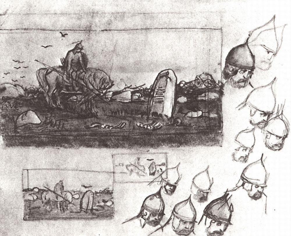 Ti offriamo una riproduzione artigianale su tela dell'opera famosa 'Schizzi per la pittura su "A cavalieri al bivio"' di Viktor Vasnetsov, dal Museo delle Riproduzioni.