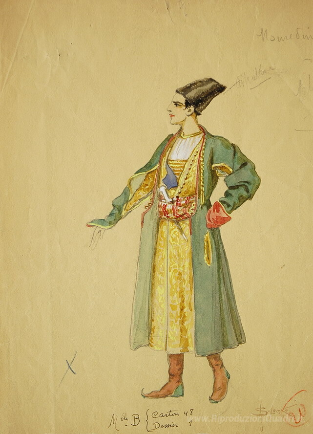 Ti offriamo una riproduzione artigianale su tela dell'opera famosa 'Schizzo del costume' di Sergey Solomko, dal Museo delle Riproduzioni.
